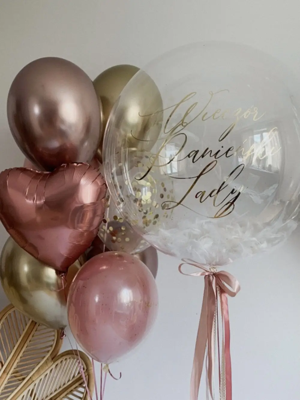 przezroczysty balon Bubble 50 cm z piórkami w środku i napisem